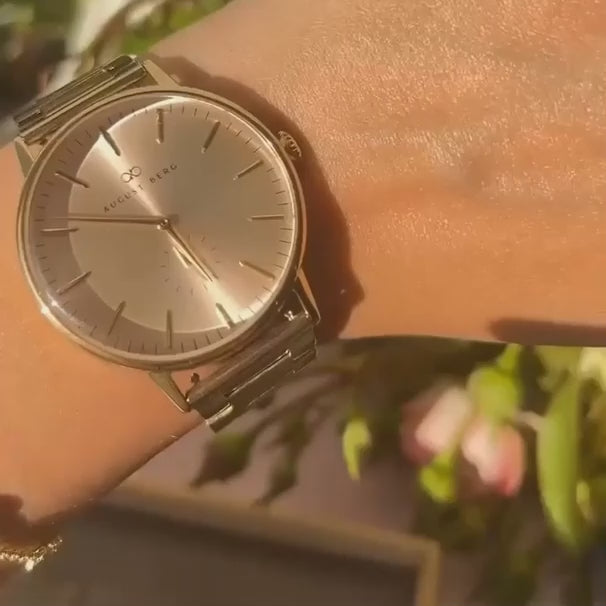 A double Gold case in 40mm made of pure, high quality, surgical grade Steel (316L) is combined with a 2-tone brushed-polished solid H link band with double push butterfly buckle, giving a unique August Berg look and feel. The oversized crown features an engraved AB-infinity logo which gives the watch a distinctive look.